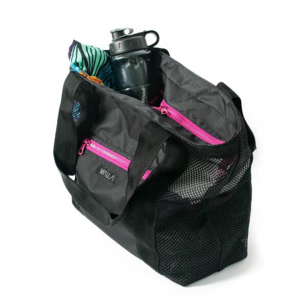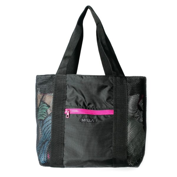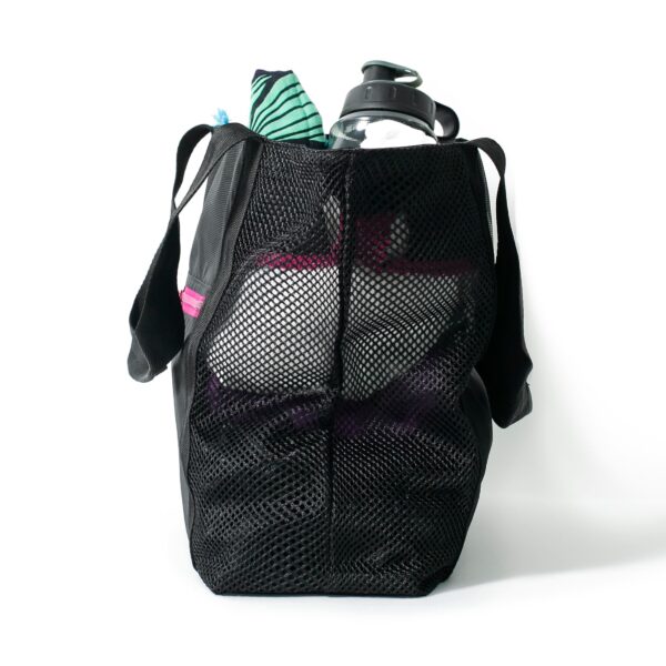 Bolsa con extremos laterales en malla, base rígida y cierre tractor superior y frontal.